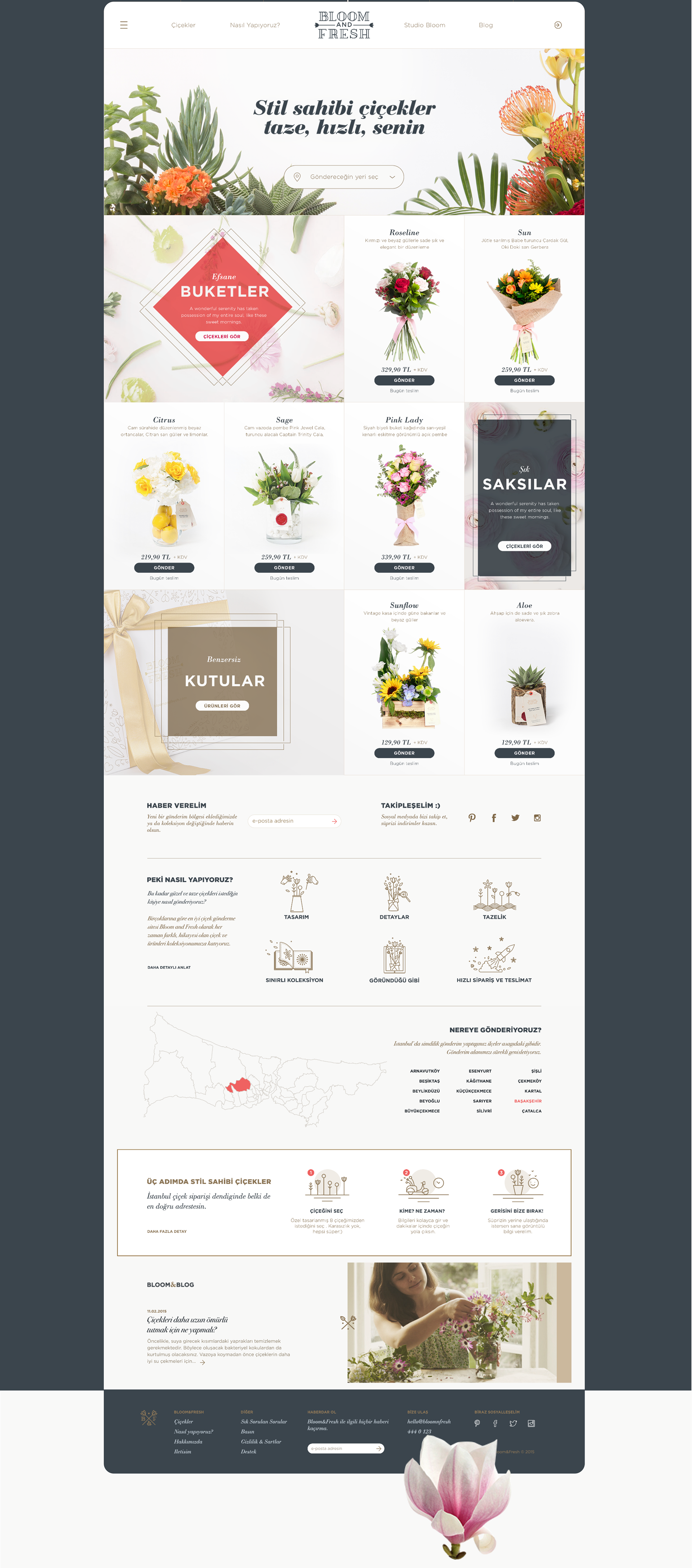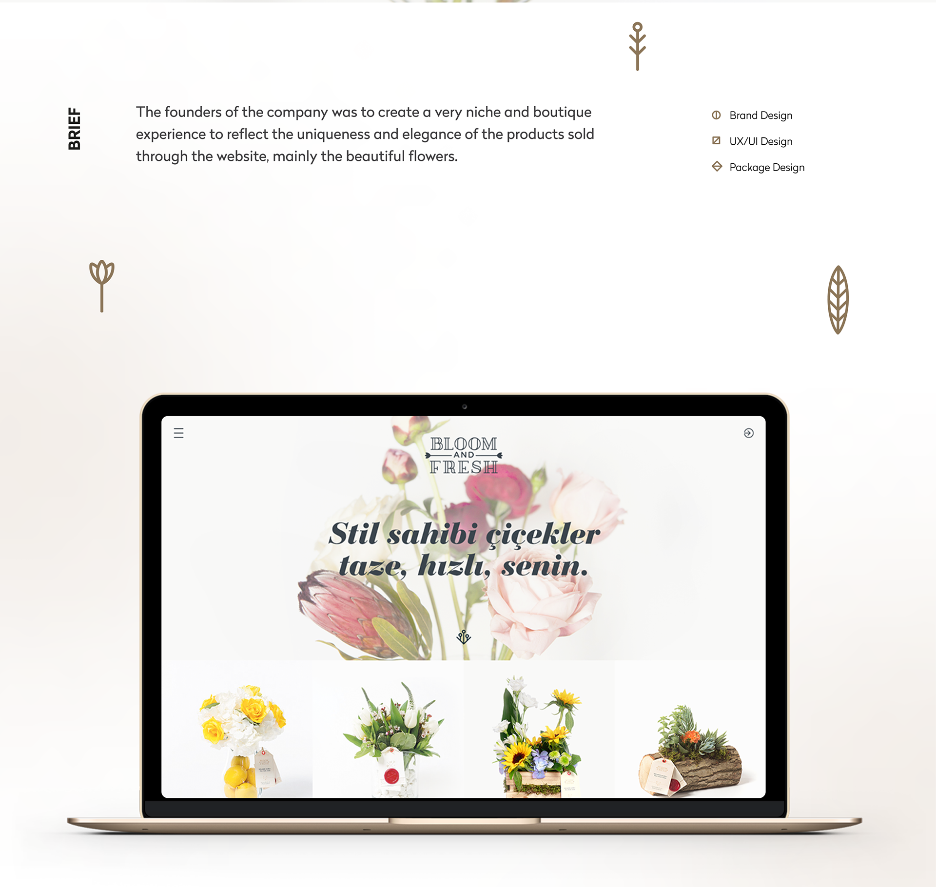We crafted a full brand identity, digital experience, and packaging design system for Bloom & Fresh — a Turkey-based flower delivery brand. From logo to e-commerce and gifting details, every touchpoint was designed to express joy, clarity, and elegance.
