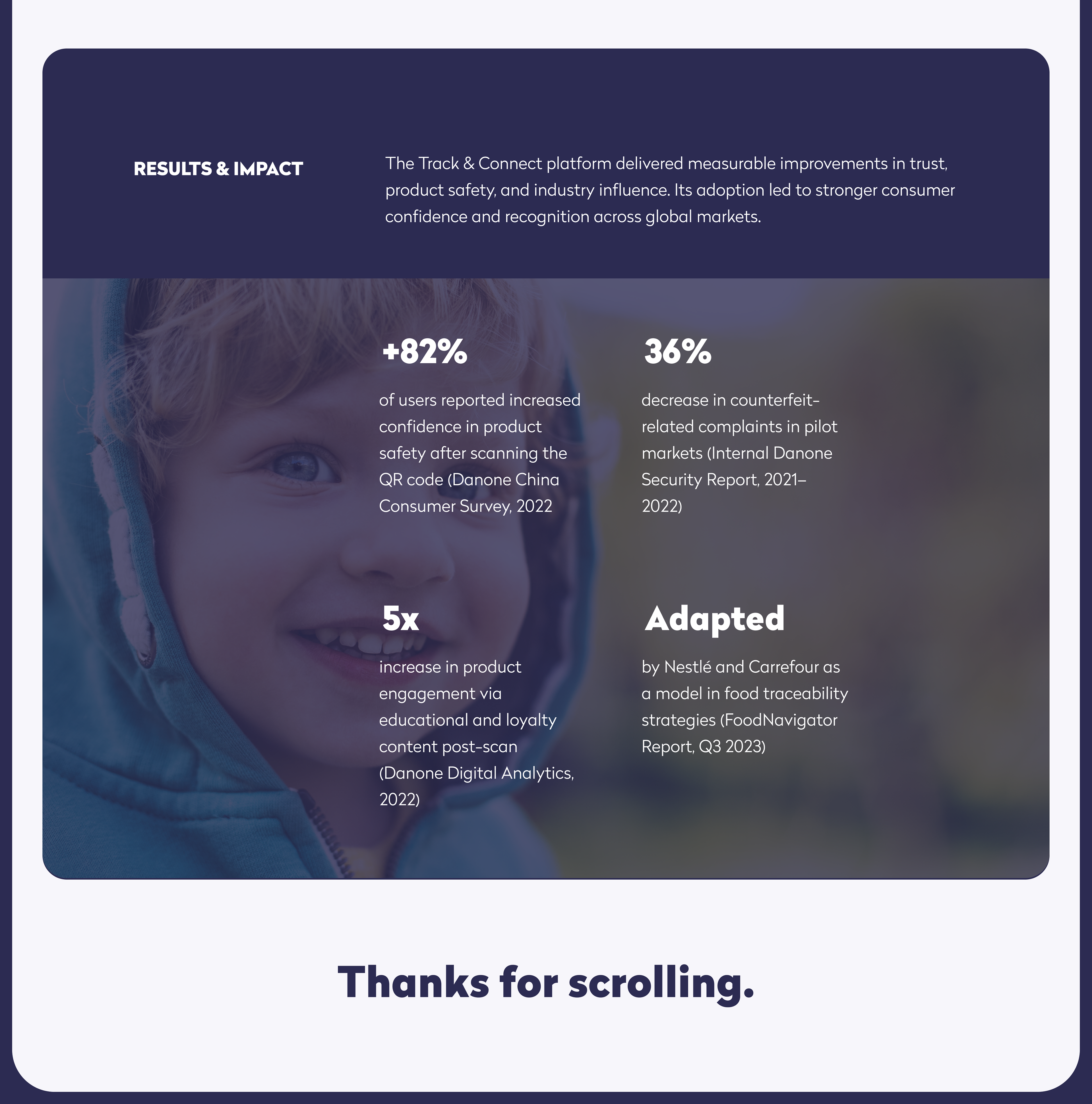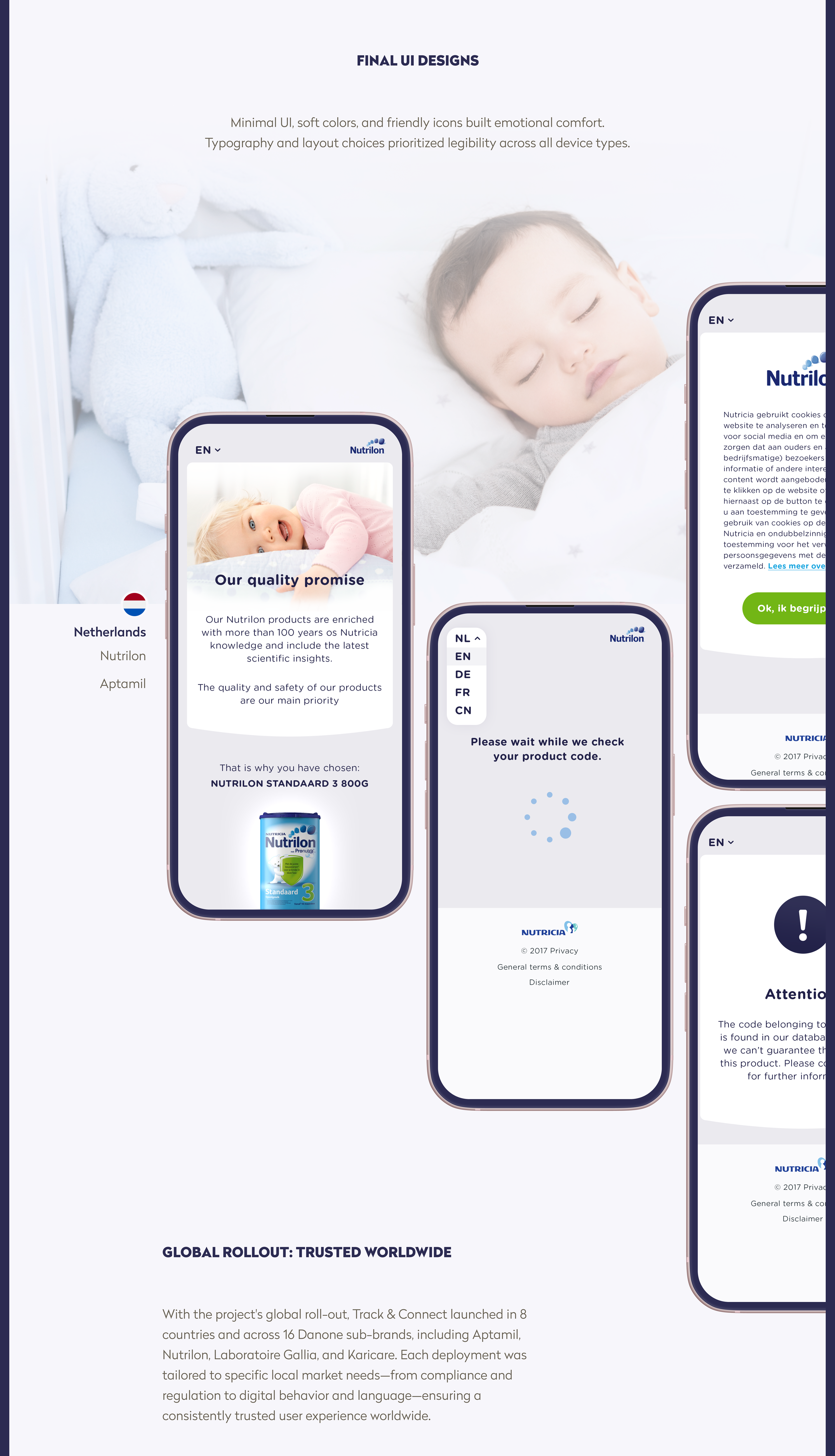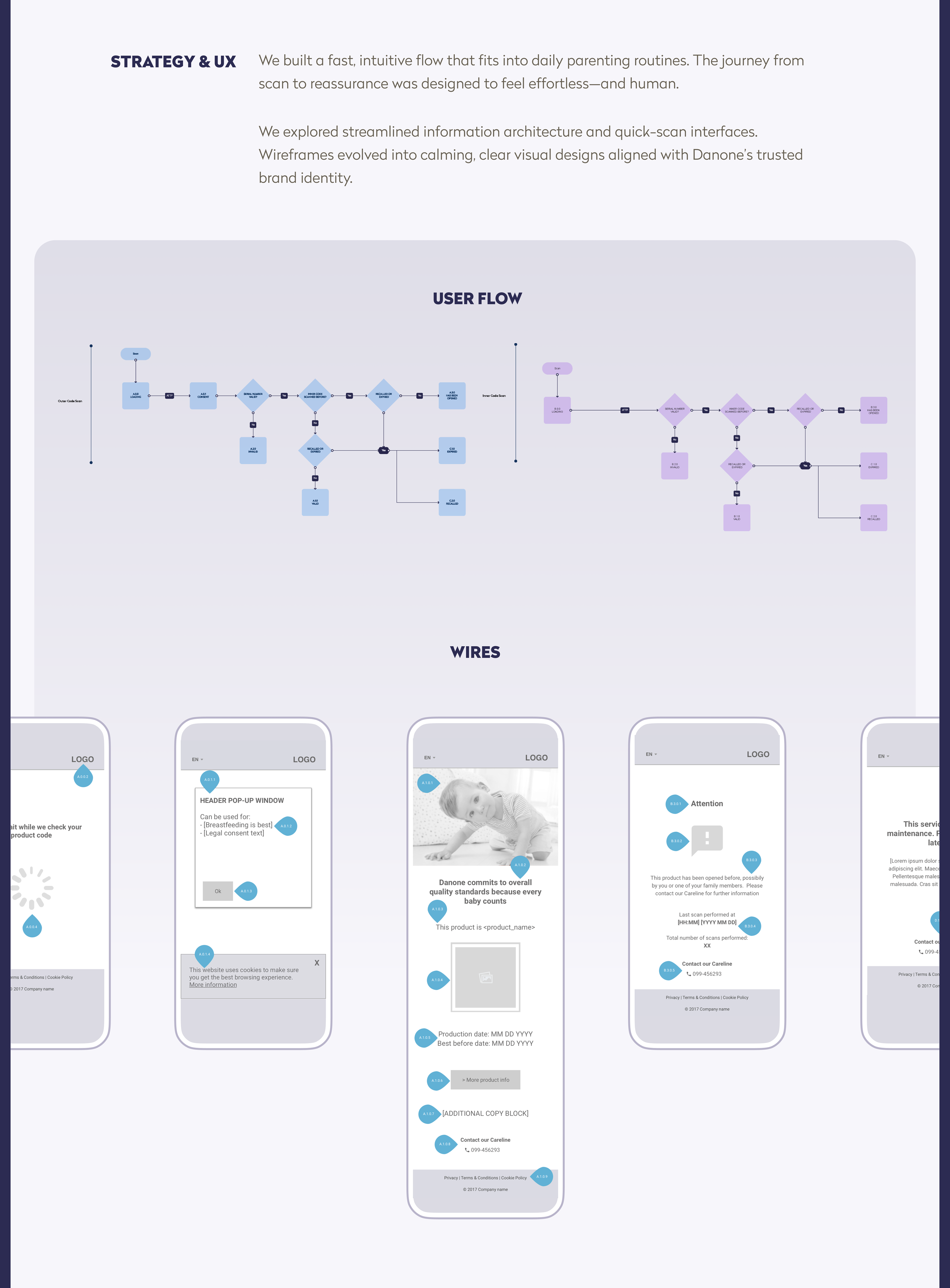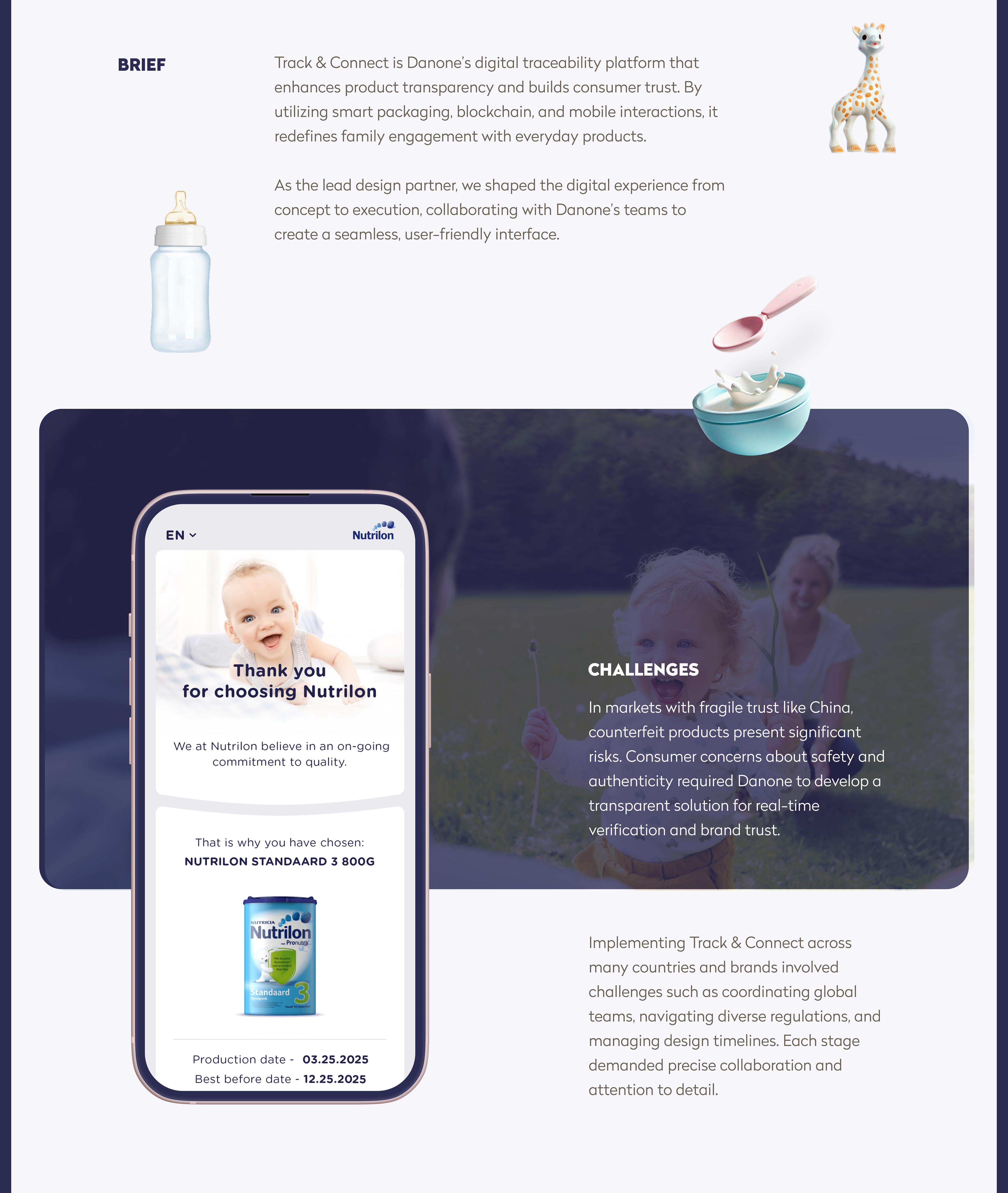 Track & Connect is Danone’s digital traceability platform that enhances product transparency and builds consumer trust. By utilizing smart packaging, blockchain, and mobile interactions, it redefines family engagement with everyday products. As the lead design partner, we shaped the digital experience from concept to execution, collaborating with Danone’s teams to create a seamless, user-friendly interface. We led the UX and UI design for the mobile interface and QR interaction journey. Our scope also included wireframes, responsive layout design, user testing, and localization for multiple markets.
