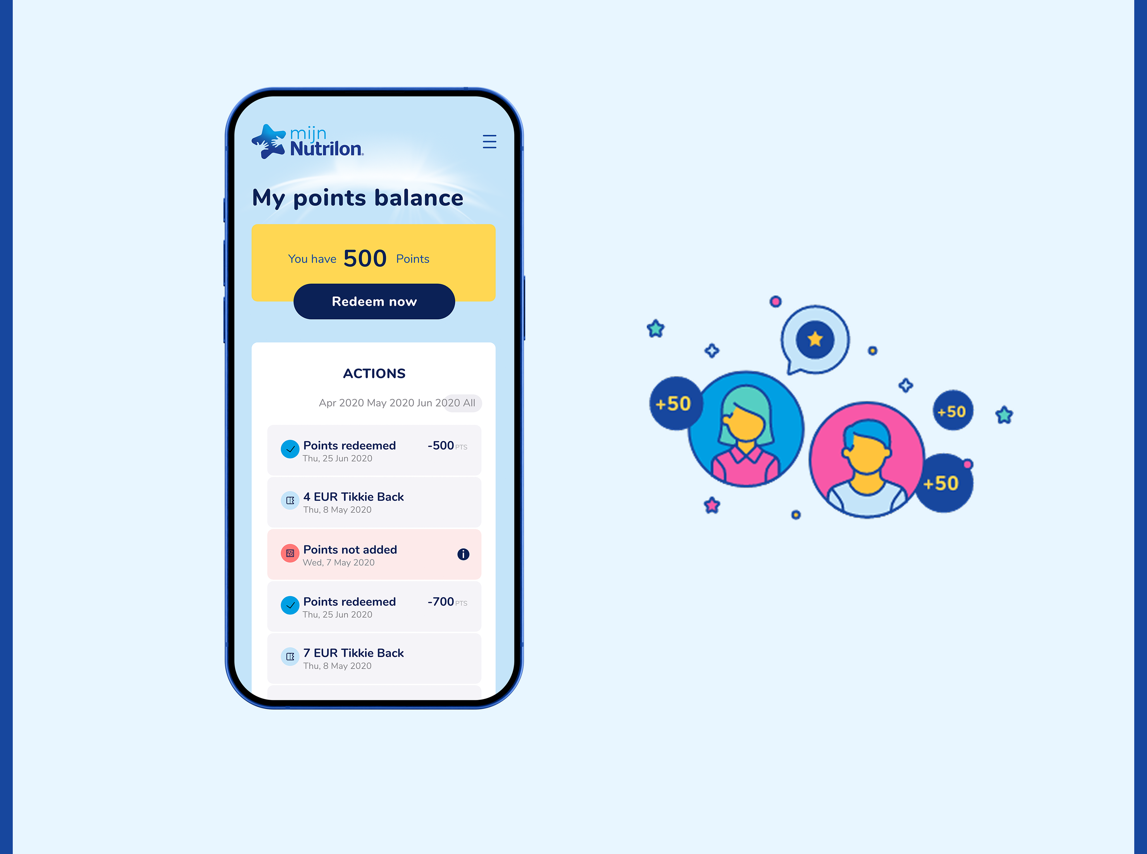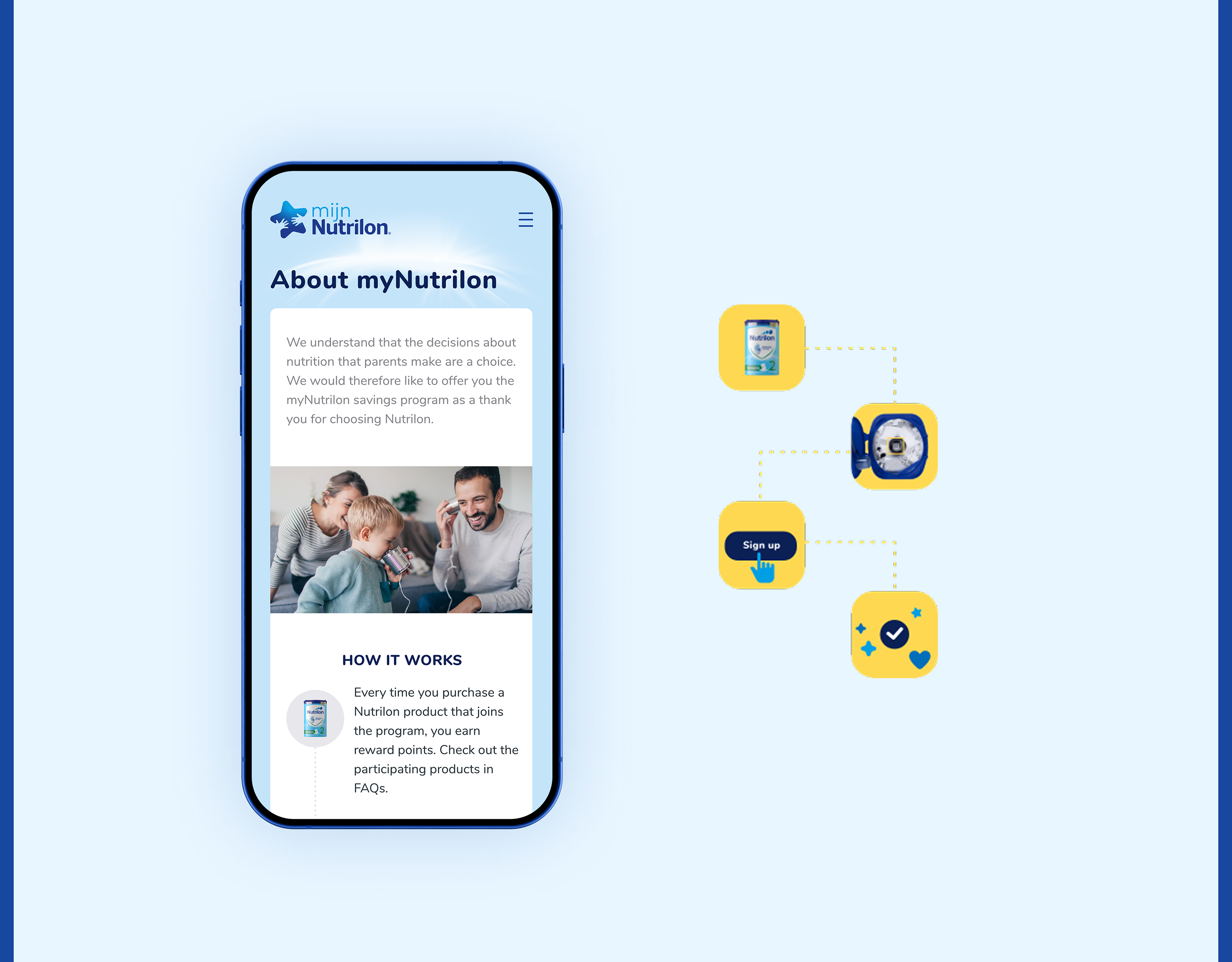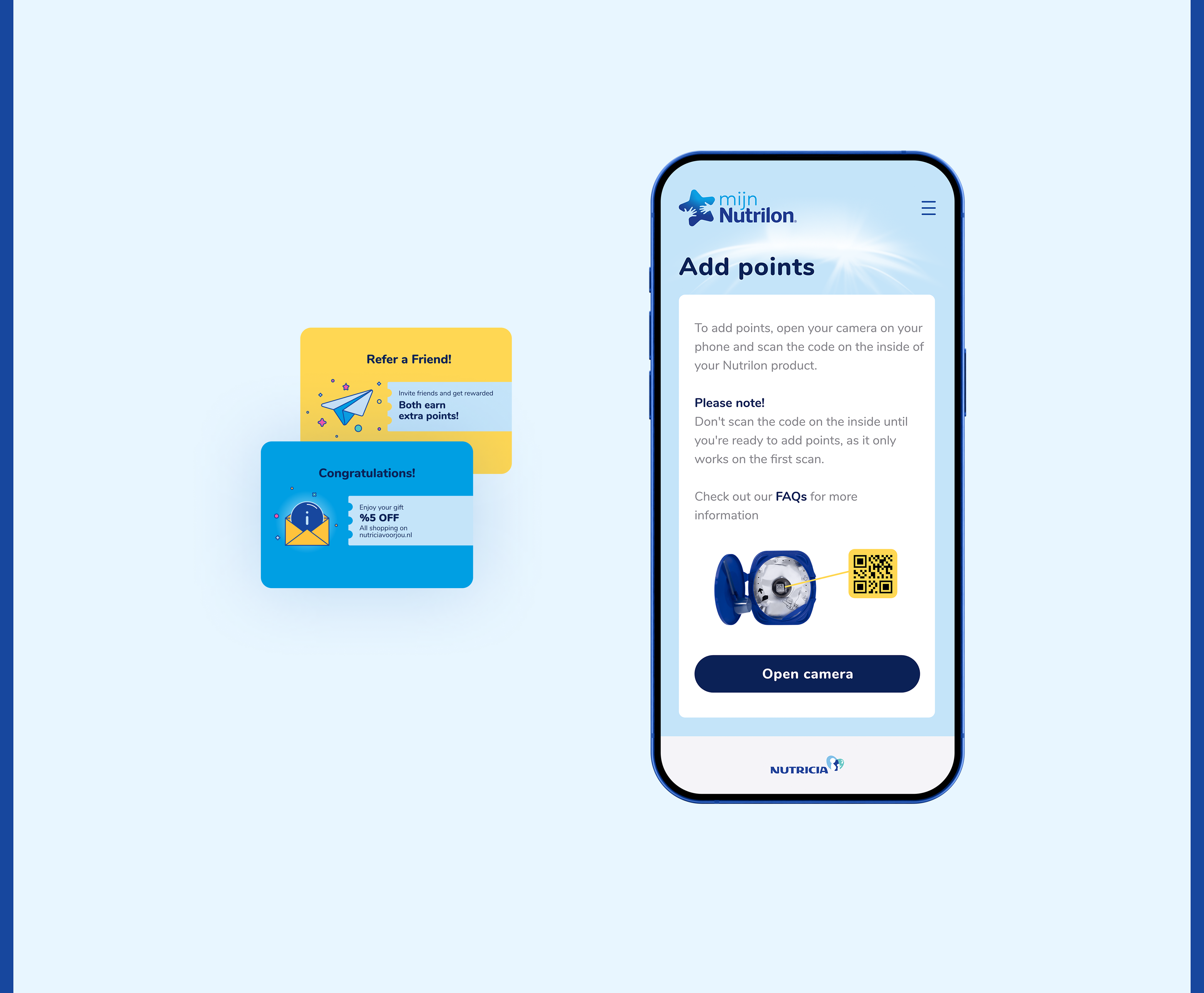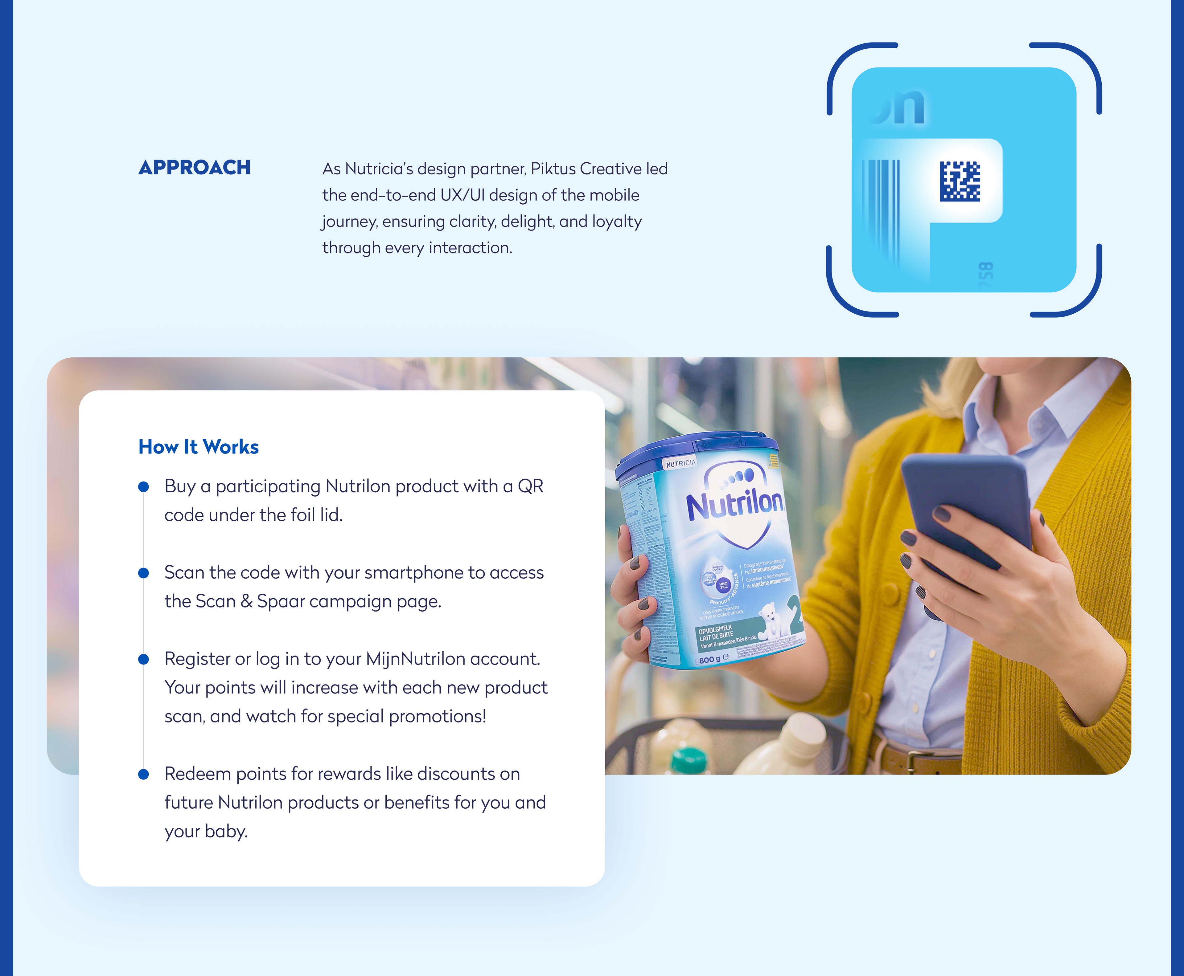 Nutrilon Scan & Spaar is a loyalty platform for Dutch parents that allows them to engage with Nutrilon products through an easy-to-use digital system. By scanning QR codes on products, users can earn rewards like cashback or special baby-related offers. Piktus Creative led the digital transformation of this concept, turning a basic operation into a seamless and enjoyable experience. Our work included branding, UX strategy, UI design, and front-end development, with integration into Nutricia's systems and the Tikkie payment platform, all designed with the user's daily life in mind.
