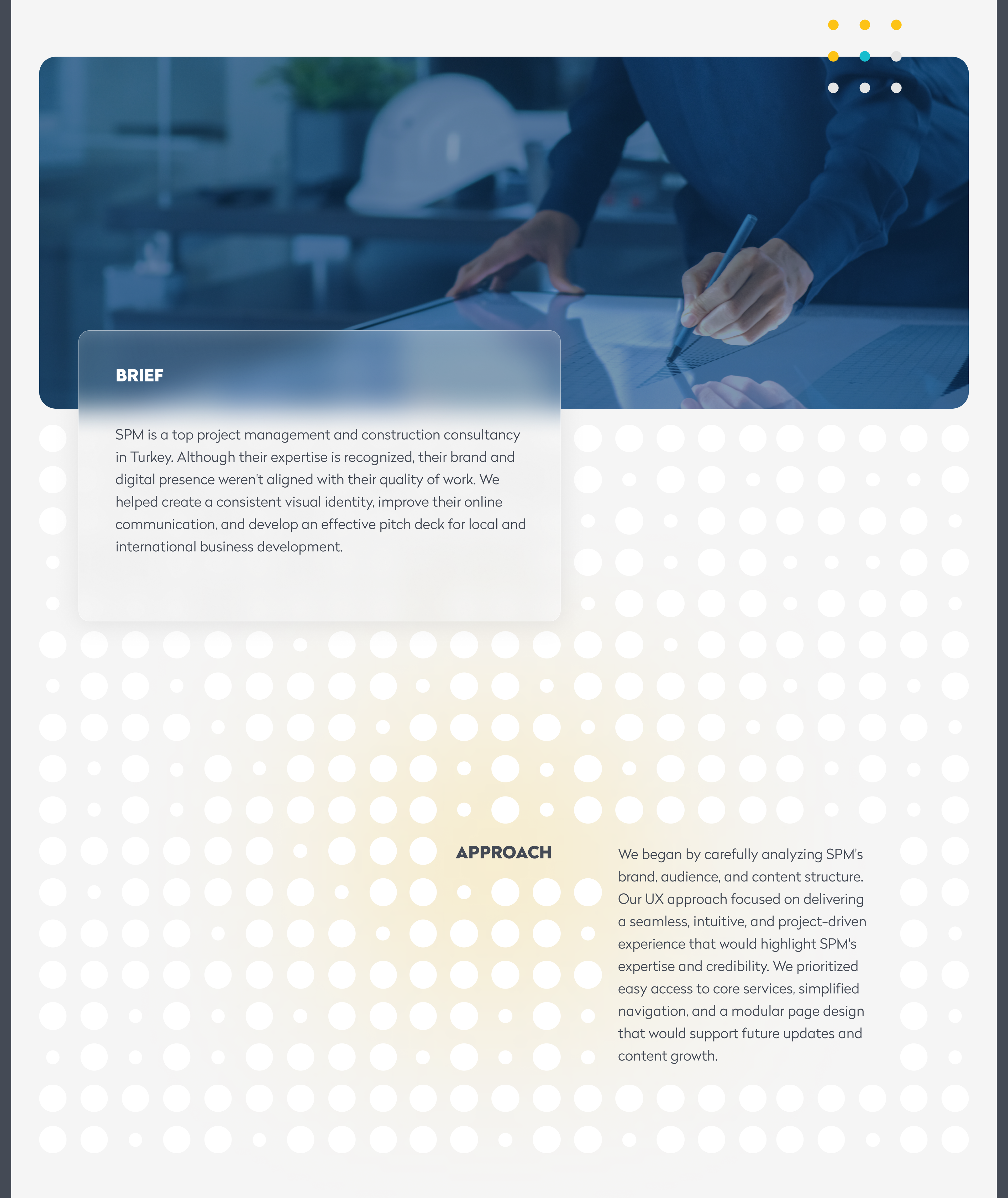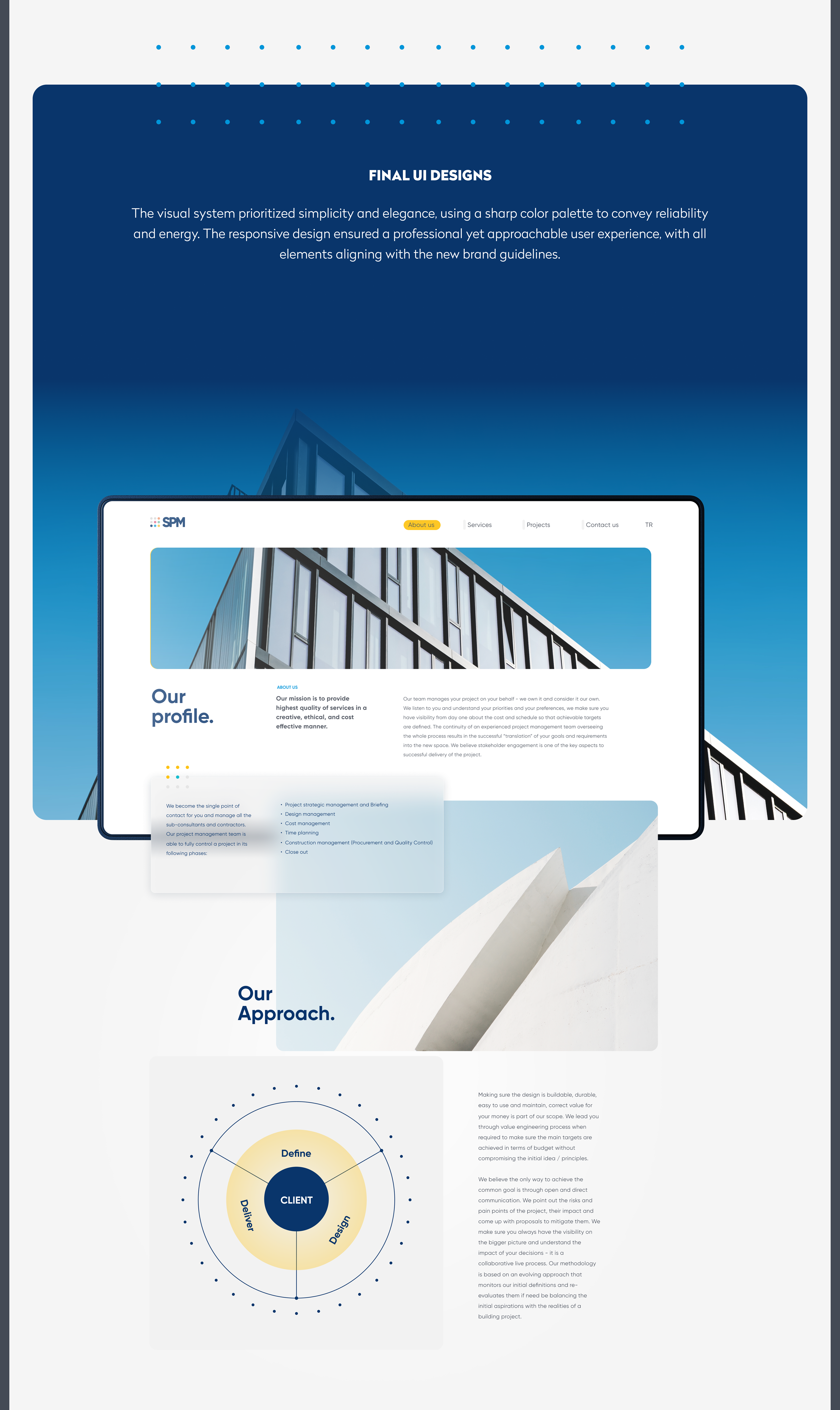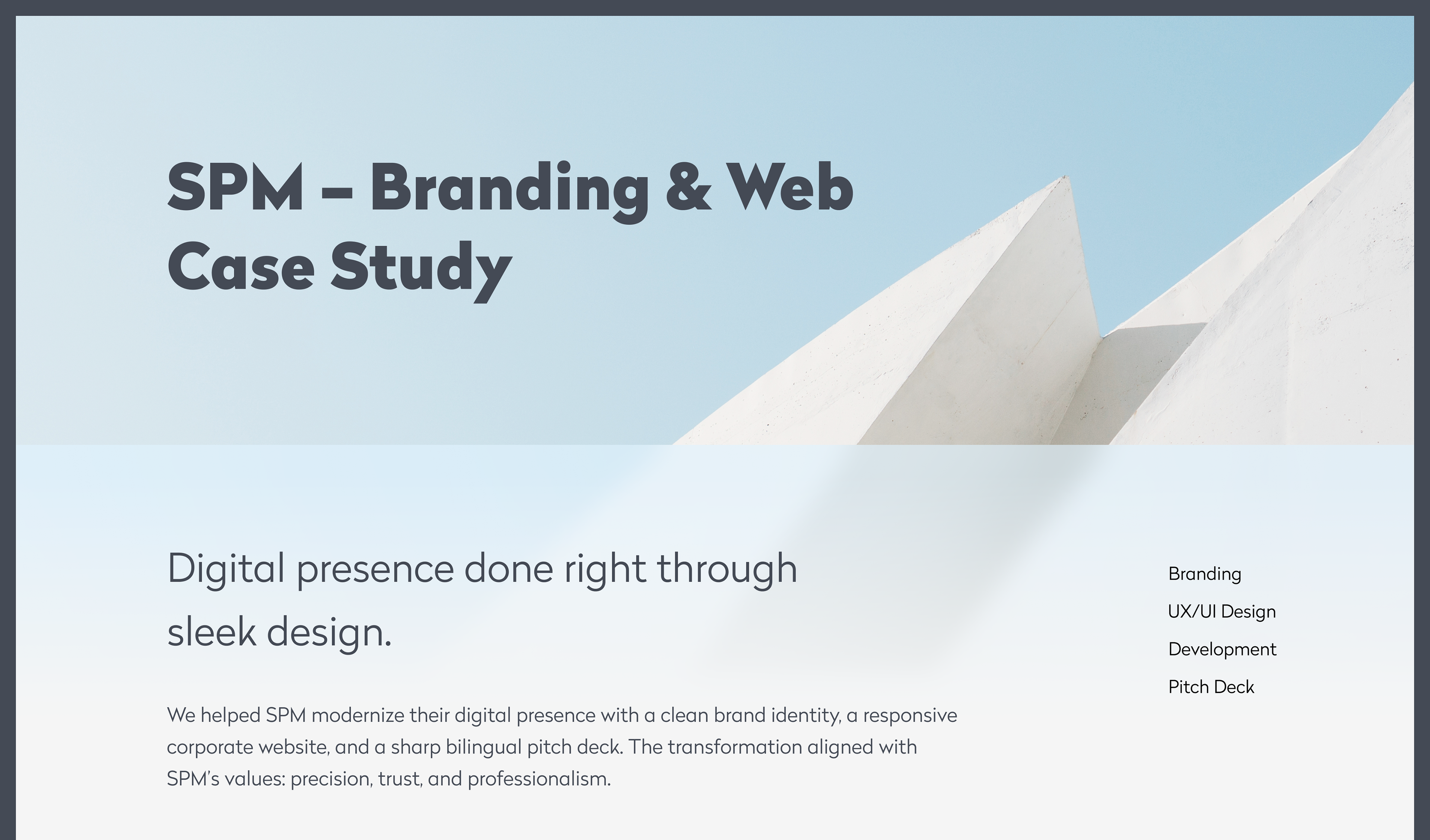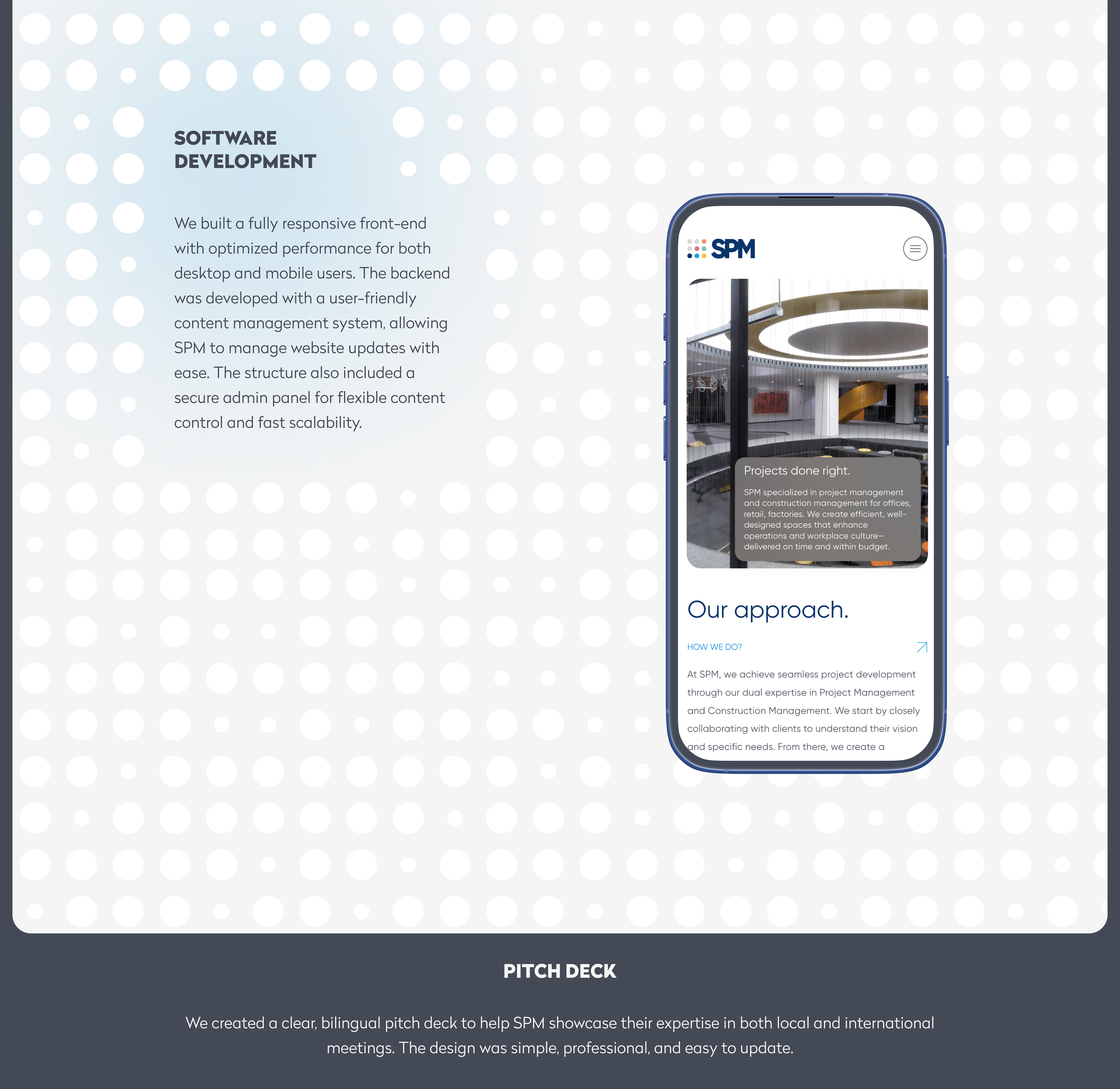 For SPM, a top-tier construction consultancy, we developed a compact brand system, a responsive corporate website, and a bilingual investor pitch deck — all aligned to communicate trust and structure.